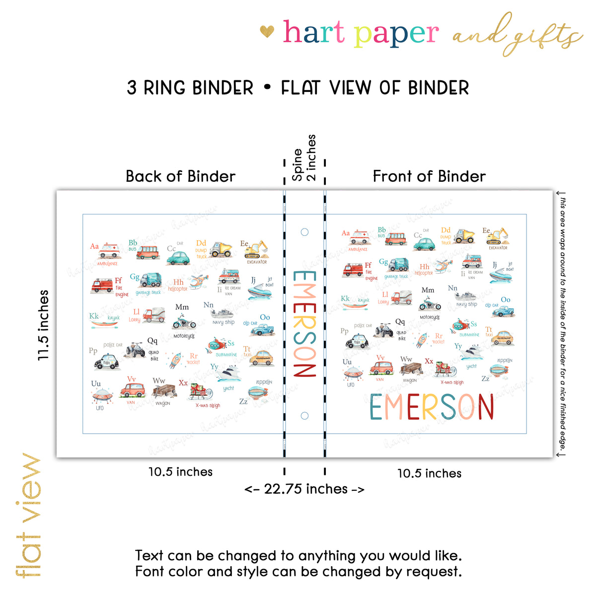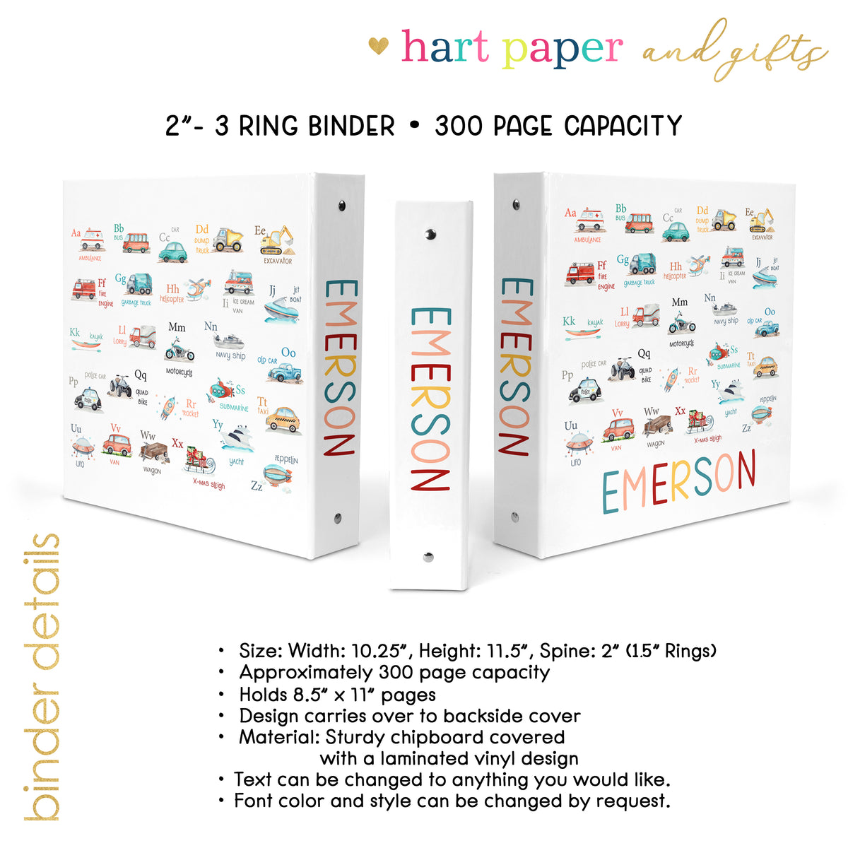 Alphabet Cars Trucks Personalized Custom 2" 3 Ring Binder • School Office Supplies