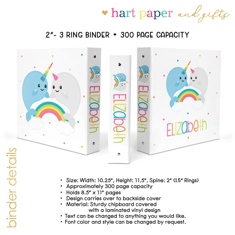 Rainbow Narwhal Personalized Custom 2" 3 Ring Binder • School Office Supplies
