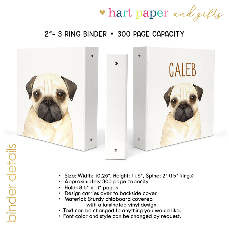 Pug Dog Puppy Personalized Custom 2" 3 Ring Binder • School Office Supplies