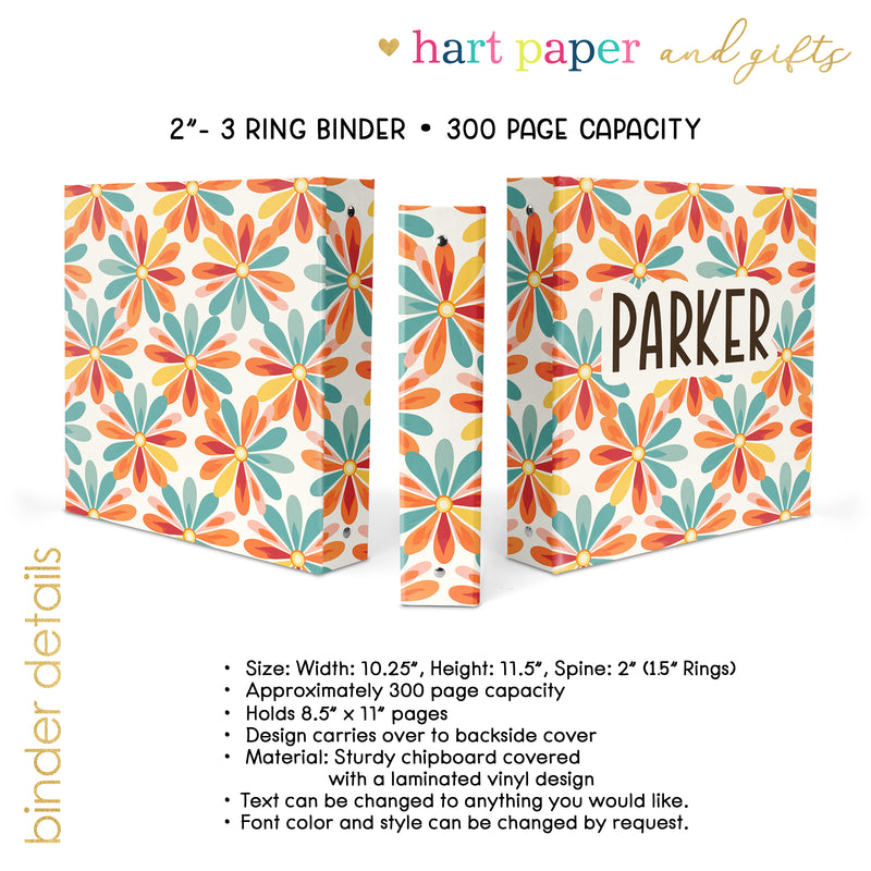Retro Flowers Personalized Custom 2" 3 Ring Binder • School Office Supplies