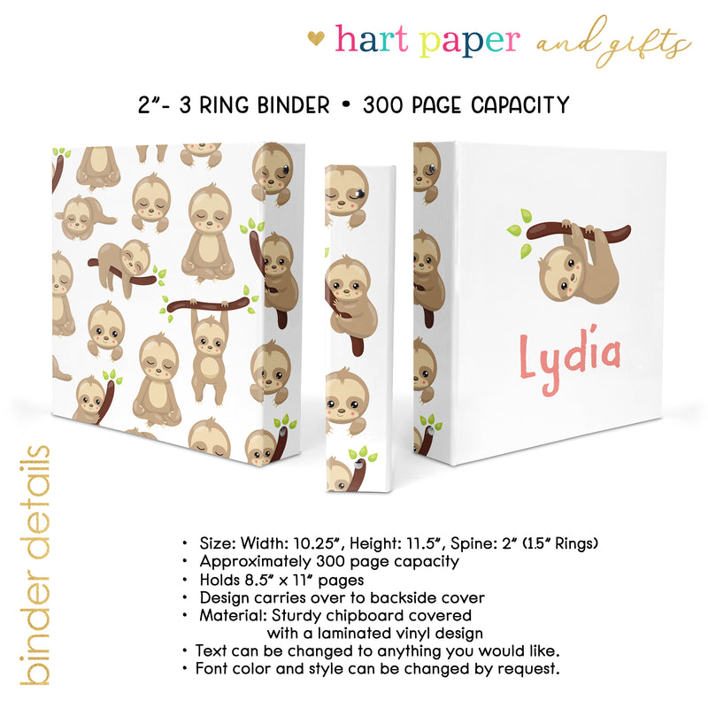 Sloth Animal Personalized Custom 2" 3 Ring Binder • School Office Supplies