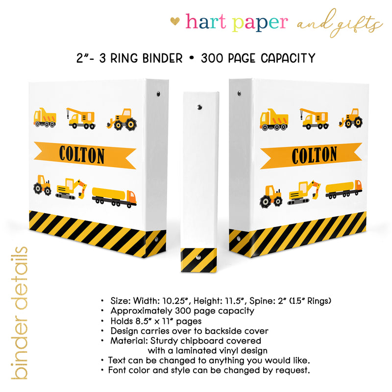 Construction Personalized Custom 2" 3 Ring Binder • School Office Supplies