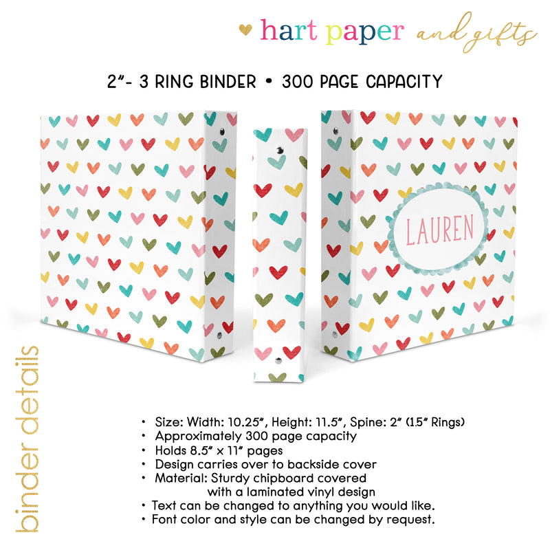Rainbow Hearts Personalized Custom 2" 3 Ring Binder • School Office Supplies