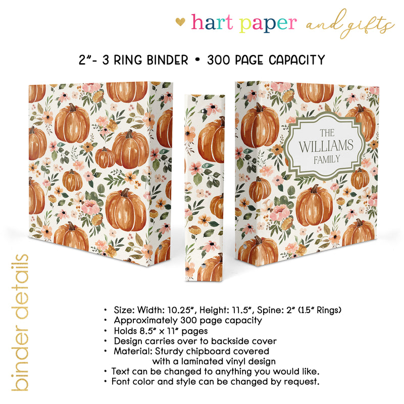Pumpkin Autumn Fall Personalized Custom 2" 3 Ring Recipe Book Binder
