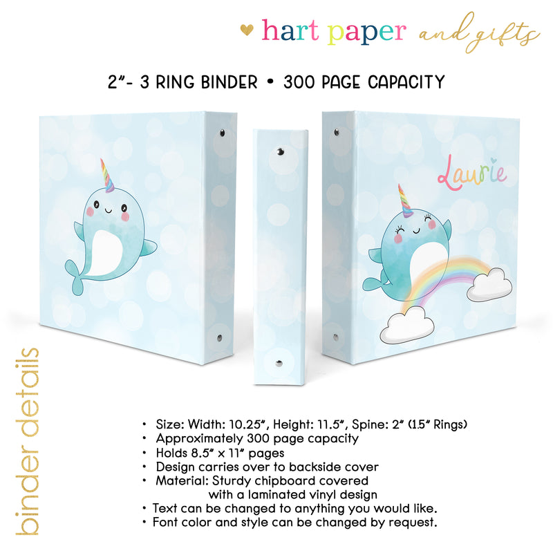 Rainbow Narwhal Personalized Custom 2" 3 Ring Binder • School Office Supplies