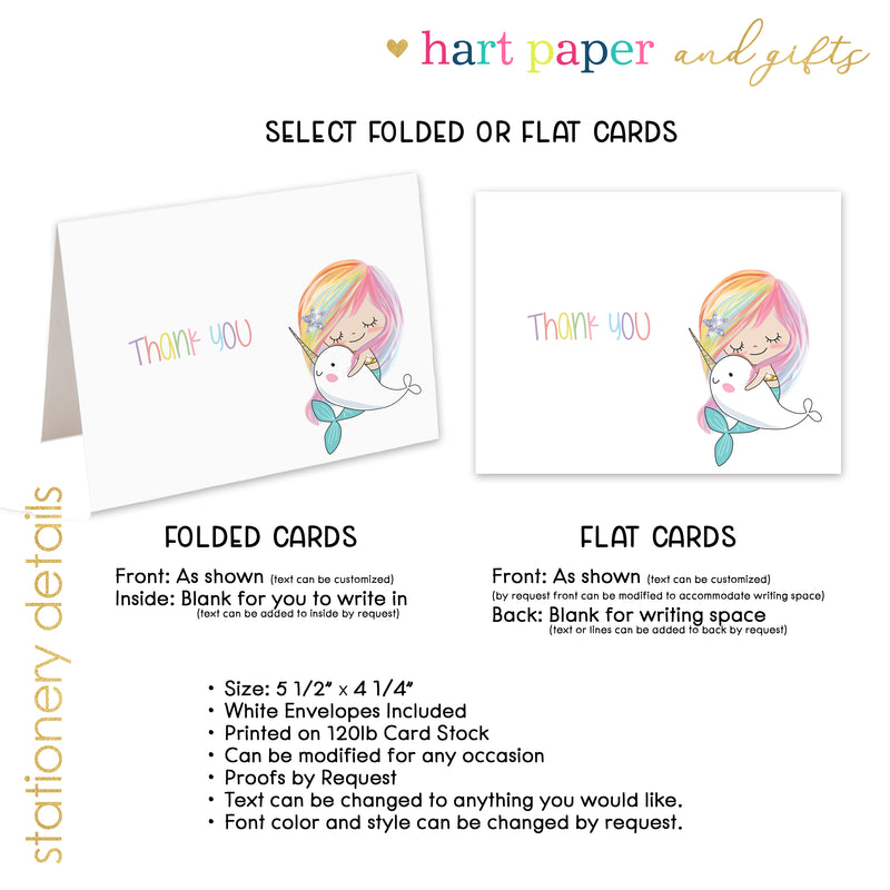 Mermaid Narwhal Rainbow Thank You Cards Note Card Personalized Custom Stationery • Flat or Folded