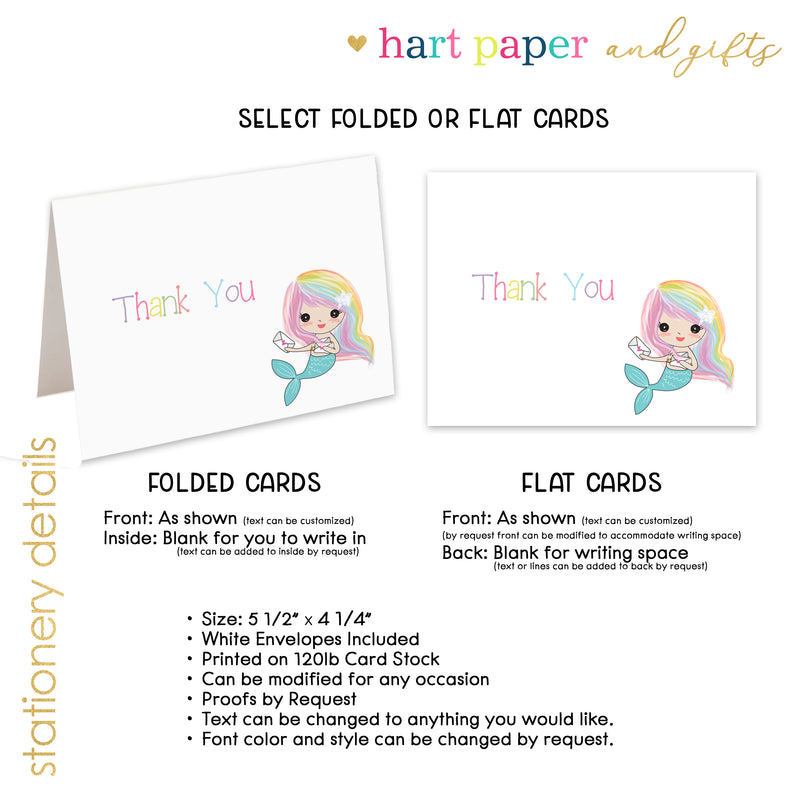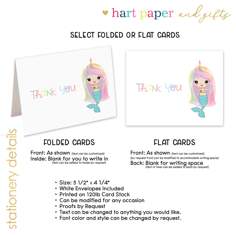 Mermaid Rainbow Thank You Cards Note Card Personalized Custom Stationery • Flat or Folded