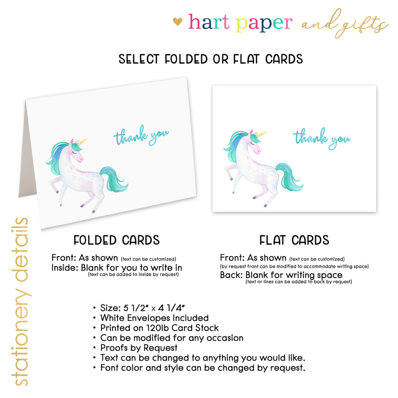 Blue Unicorn Thank You Cards Note Card Personalized Custom Stationery • Flat or Folded