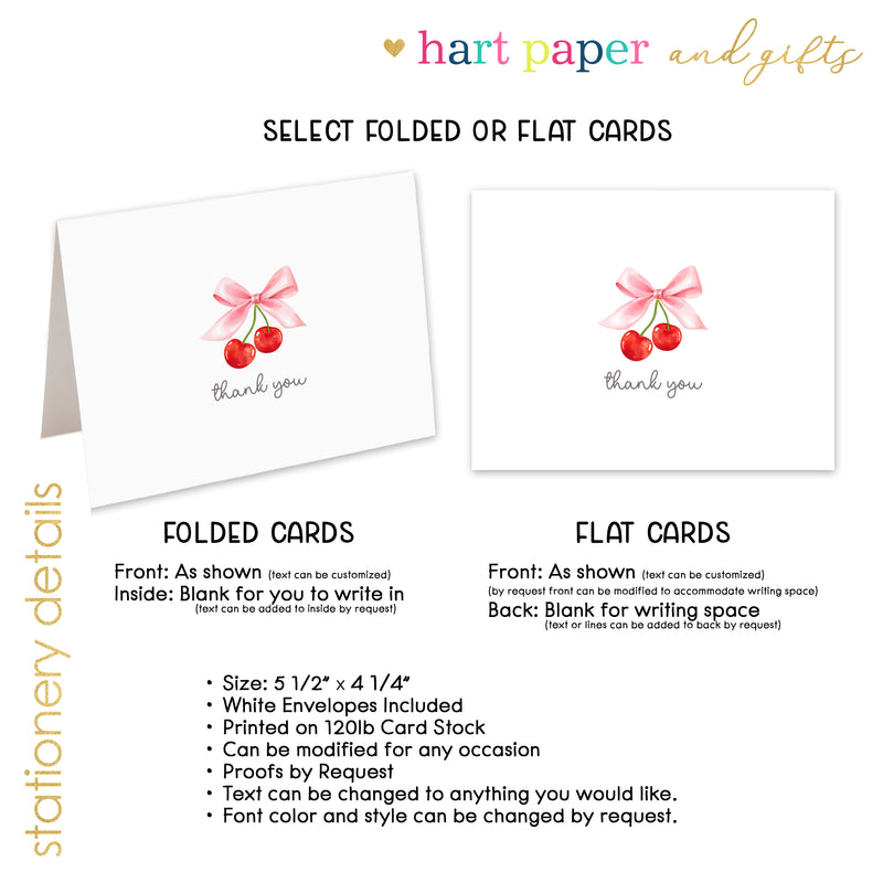 Cherry Coquette Bow Thank You Cards Note Card Personalized Custom Stationery • Flat or Folded