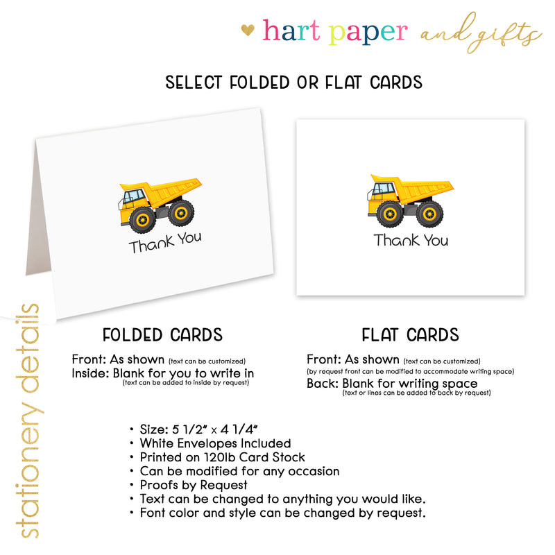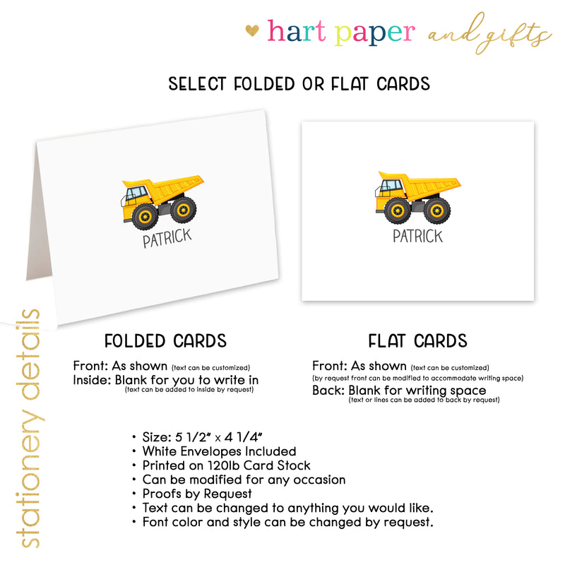 Dump Truck Thank You Cards Note Card Personalized Custom Stationery • Flat or Folded
