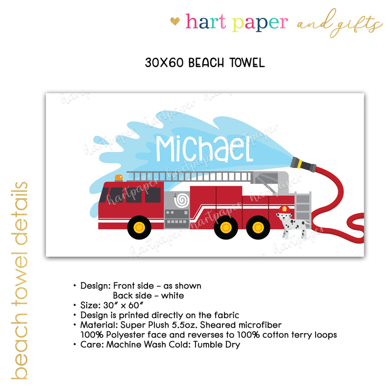 Firetruck Personalized Beach Towel • Custom 30x60 Swimming Swim Bath Bathroom Pool