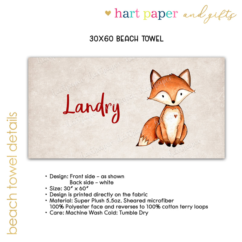 Fox Personalized Beach Towel • Custom 30x60 Swimming Swim Bath Bathroom Pool
