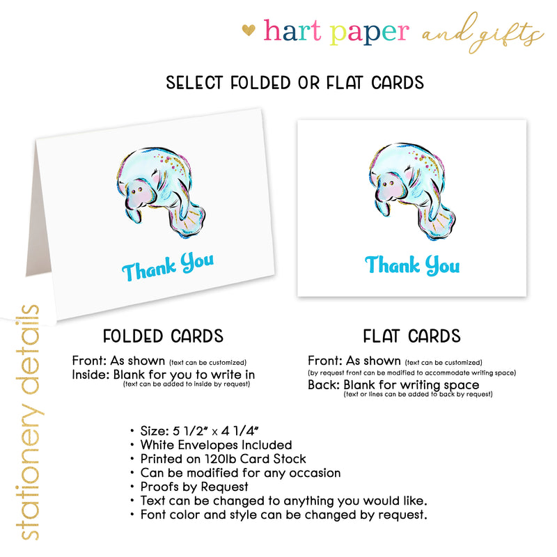 Manatee Thank You Cards Note Card Personalized Custom Stationery • Flat or Folded