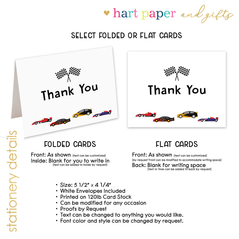 Race Cars Thank You Cards Note Card Personalized Custom Stationery • Flat or Folded
