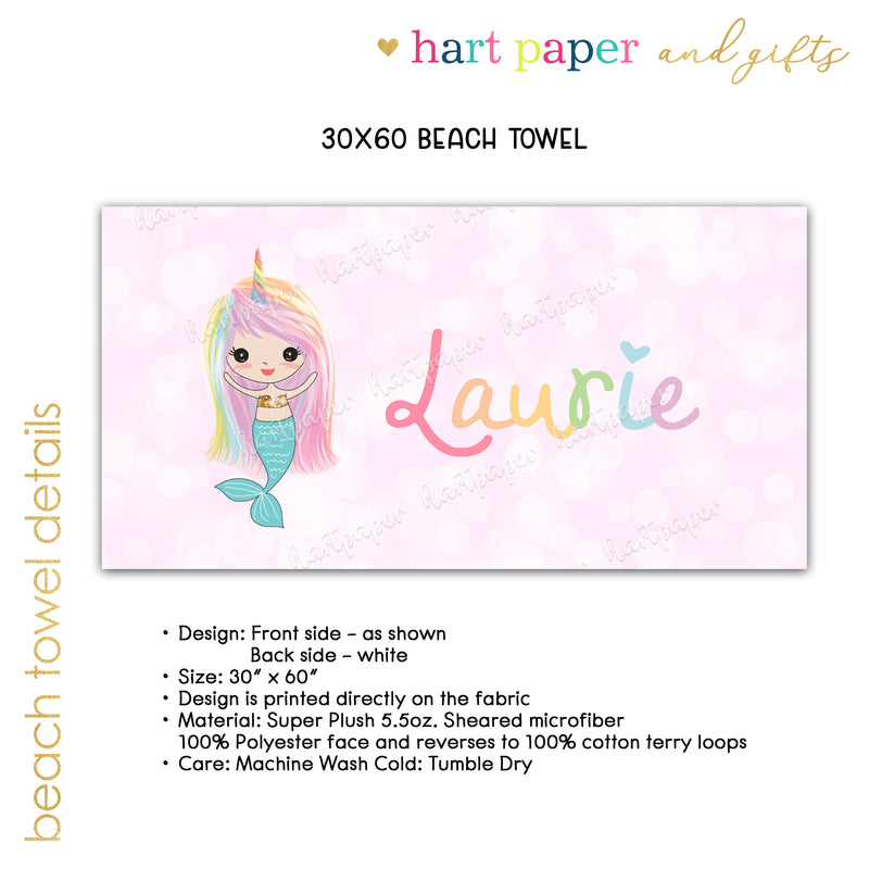 Rainbow Mermaid Narwhal Personalized Beach Towel • Custom 30x60 Swimming Swim Bath Bathroom Pool