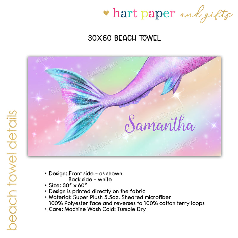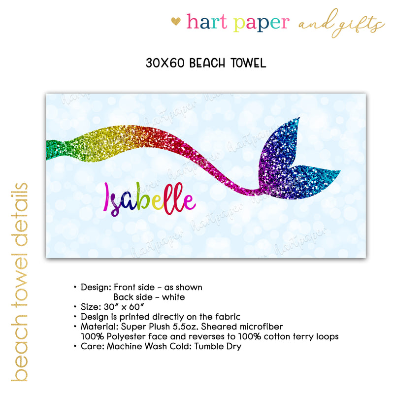 Rainbow Mermaid Tail Personalized Beach Towel • Custom 30x60 Swimming Swim Bath Bathroom Pool