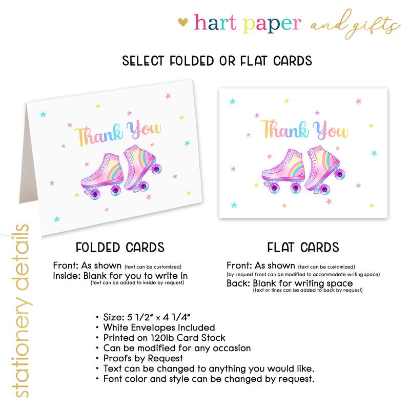 Rainbow Roller Skate Thank You Cards Note Card Personalized Custom Stationery • Flat or Folded