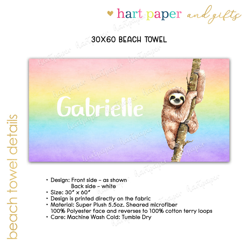 Rainbow Sloth Personalized Beach Towel • Custom 30x60 Swimming Swim Bath Bathroom Pool