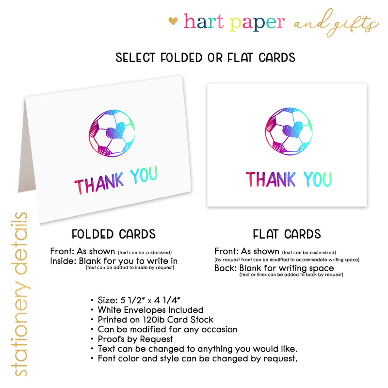 Rainbow Soccer Thank You Cards Note Card Personalized Custom Stationery • Flat or Folded