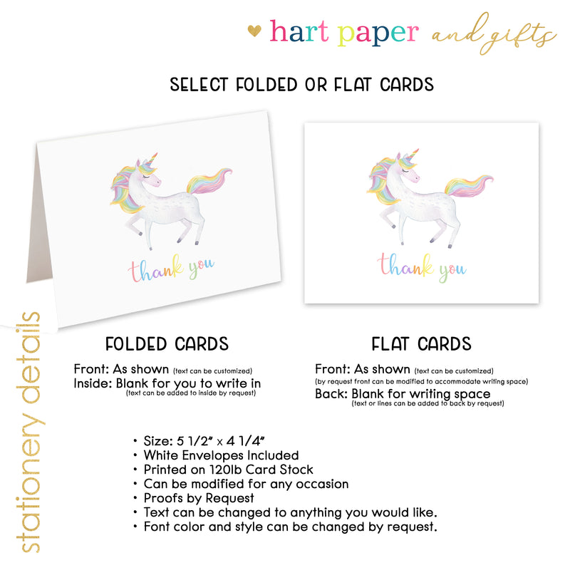 Rainbow Unicorn Thank You Cards Note Card Personalized Custom Stationery • Flat or Folded