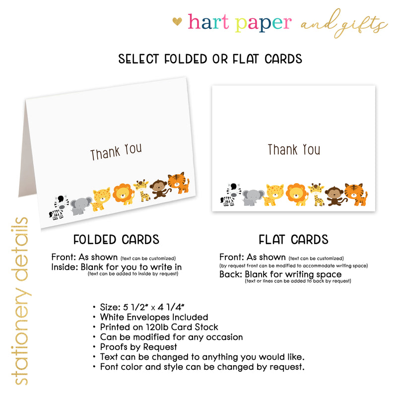 Safari Animals Thank You Cards Note Card Personalized Custom Stationery • Flat or Folded