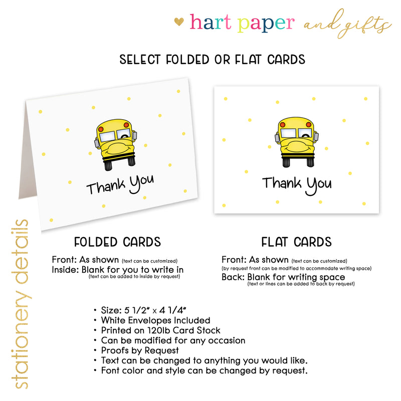 School Bus Thank You Cards Note Card Personalized Custom Stationery • Flat or Folded