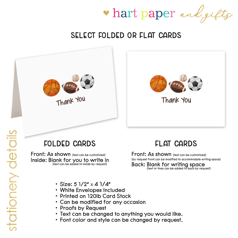Sports Balls Thank You Cards Note Card Personalized Custom Stationery • Flat or Folded