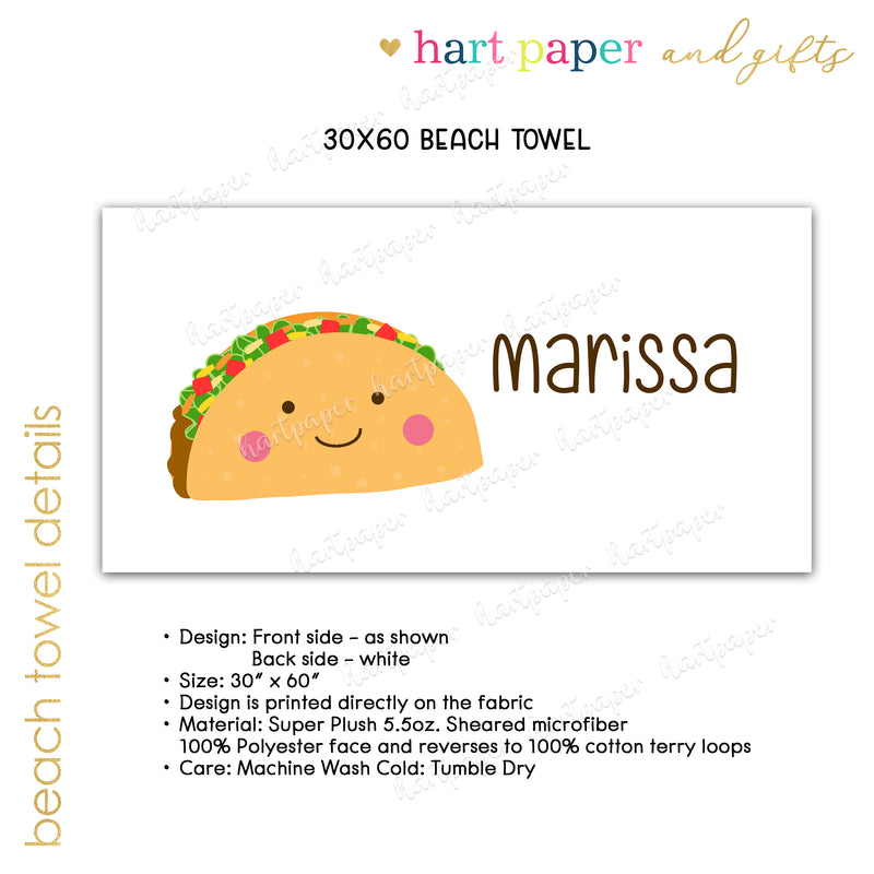 Taco Personalized Beach Towel • Custom 30x60 Swimming Swim Bath Bathroom Pool