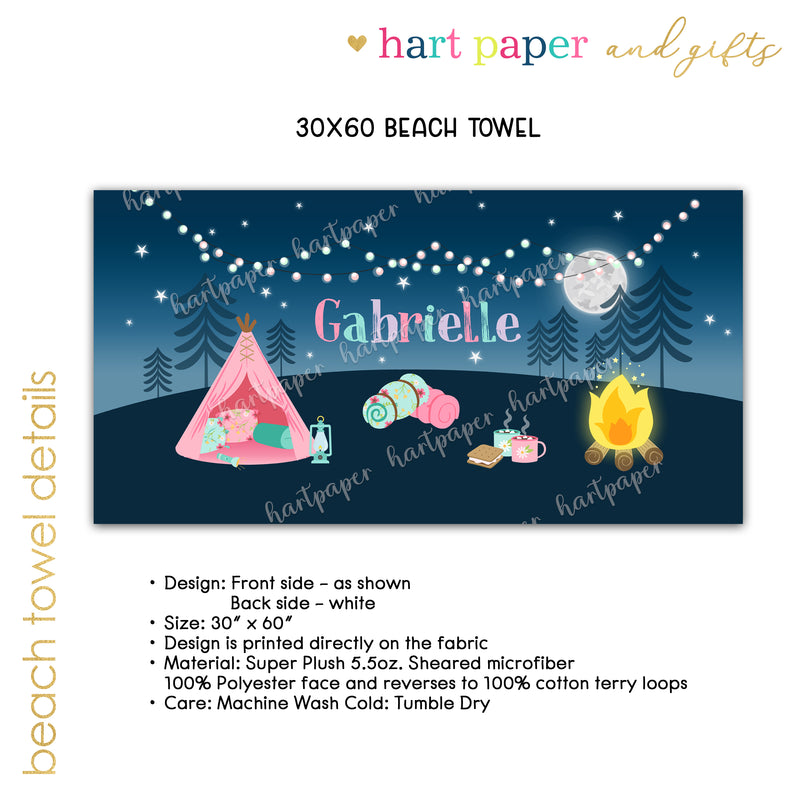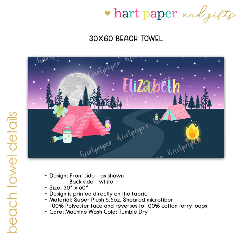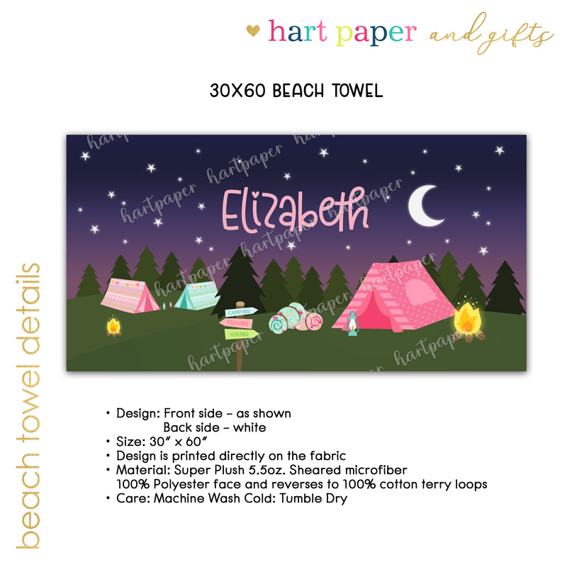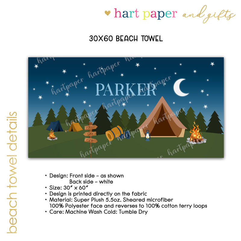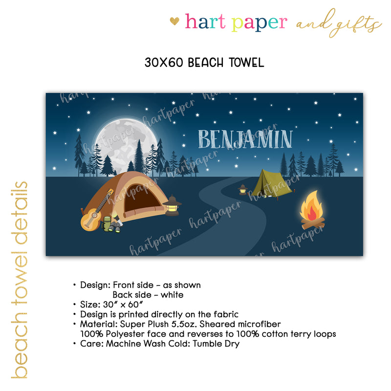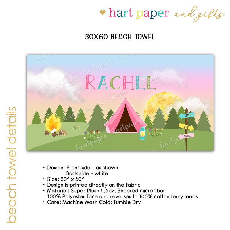 Tent Camping Camp Personalized Beach Towel • Custom 30x60 Swimming Swim Bath Bathroom Pool