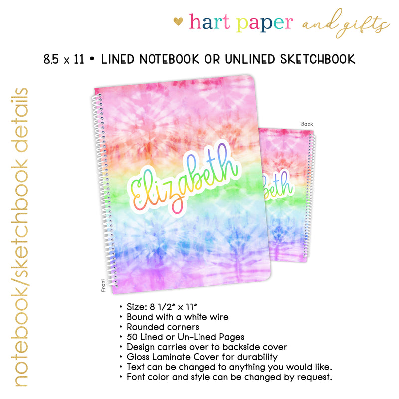 Tie Dye Rainbow Personalized Custom Notebook or Sketchbook • School Office Supplies