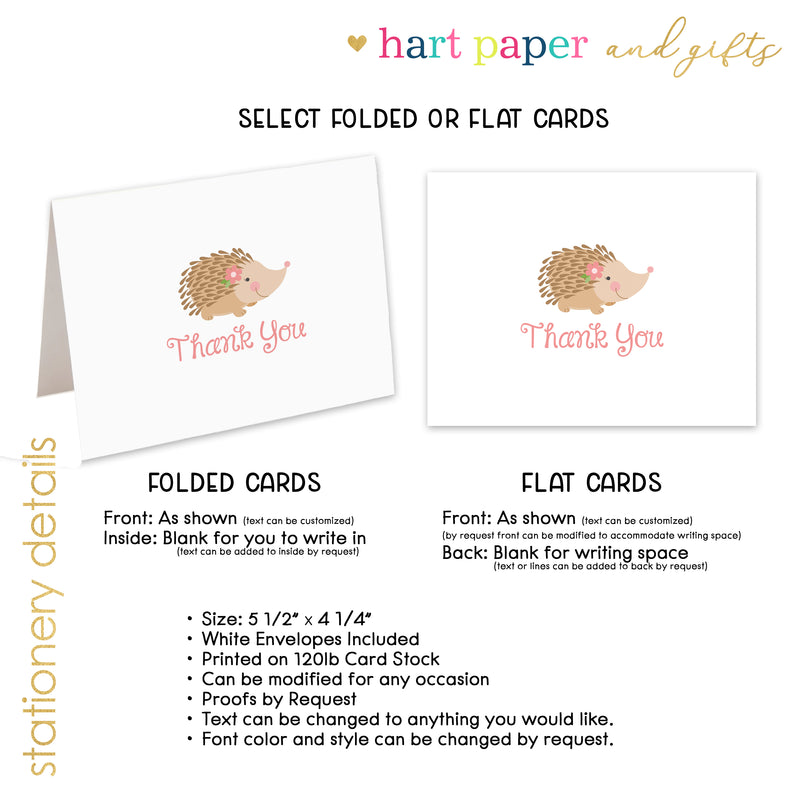 Porcupine Thank You Cards Note Card Personalized Custom Stationery • Flat or Folded