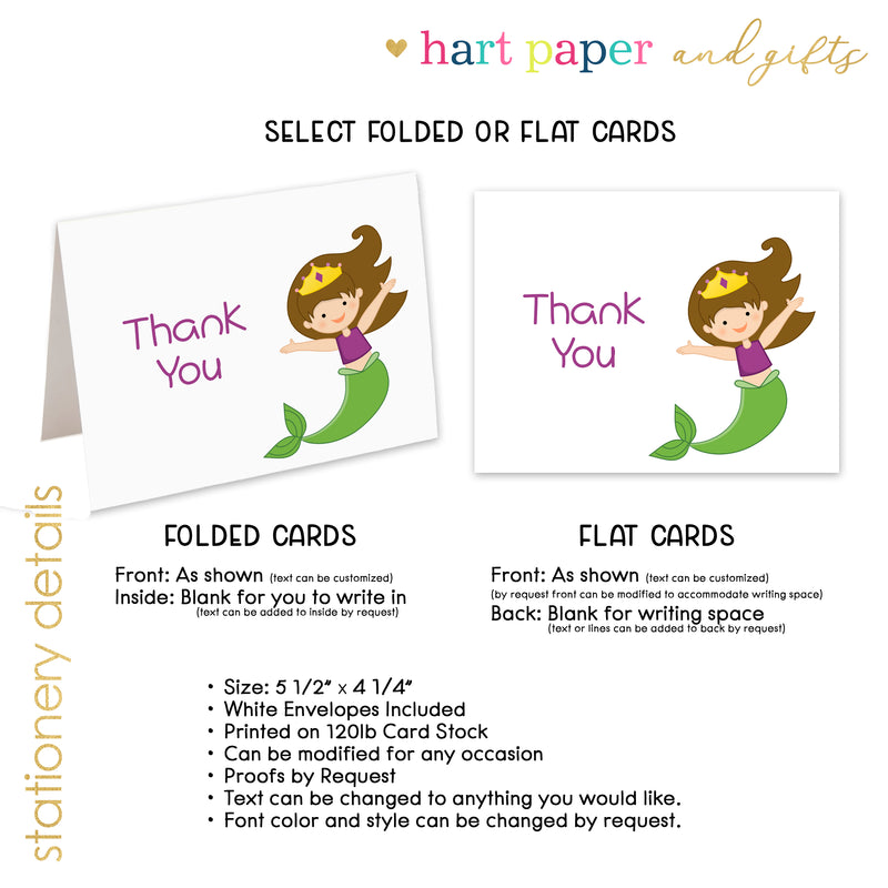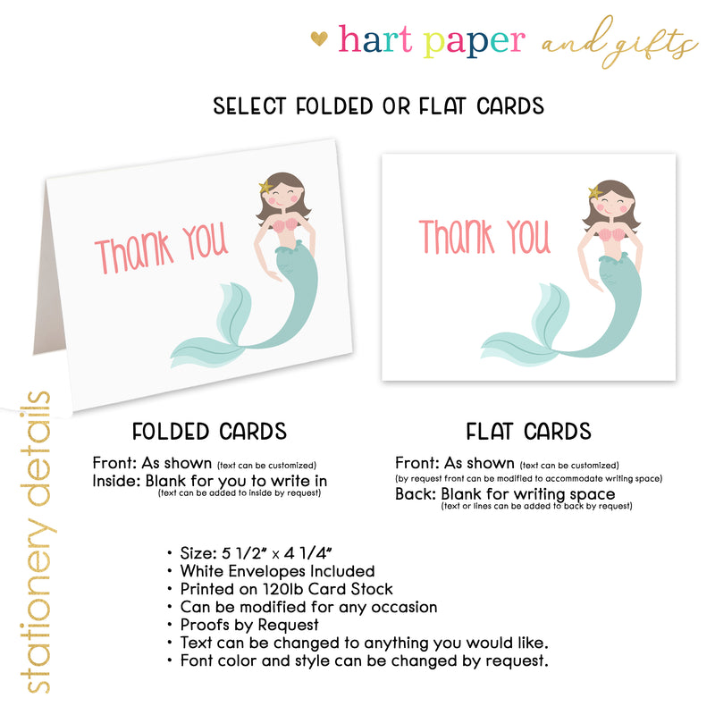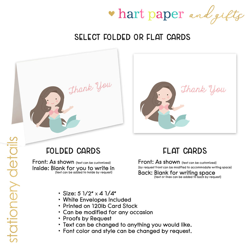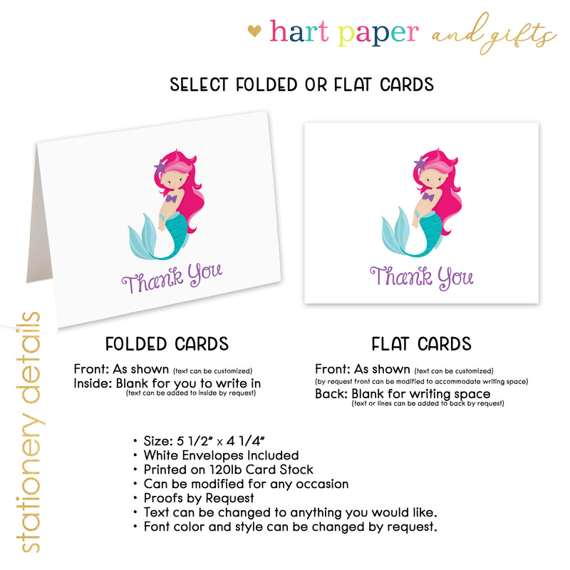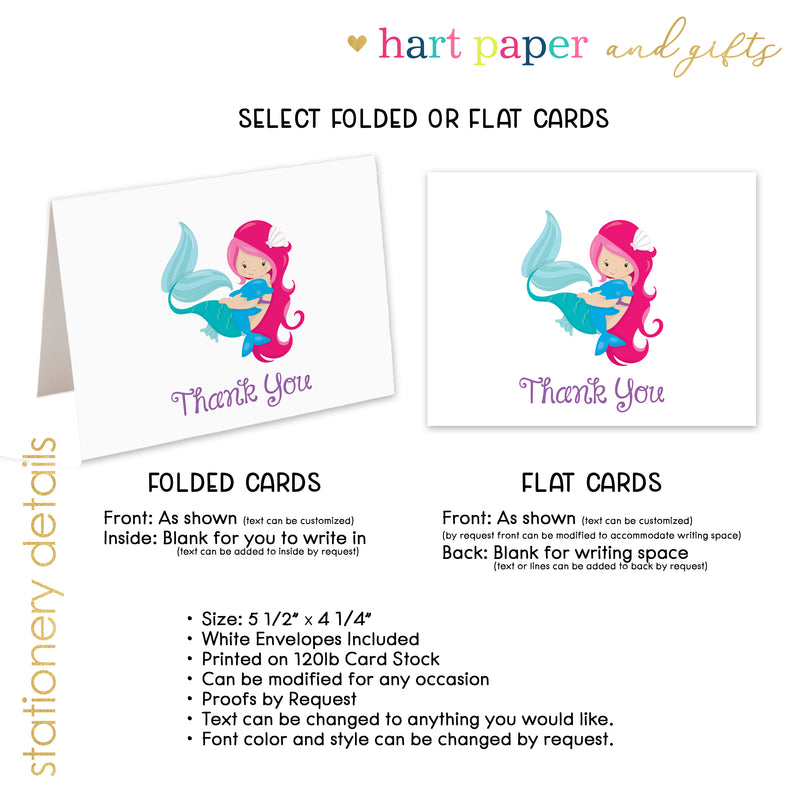 Mermaid Thank You Cards Note Card Personalized Custom Stationery • Flat or Folded