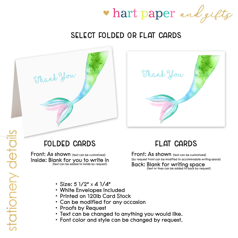 Mermaid Tail d Thank You Cards Note Card Personalized Custom Stationery • Flat or Folded