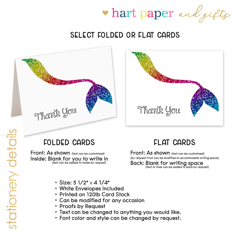 Rainbow Mermaid Tail Thank You Cards Note Card Personalized Custom Stationery • Flat or Folded