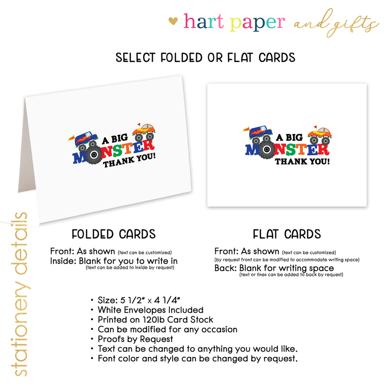 Monster Truck Thank You Cards Note Card Personalized Custom Stationery • Flat or Folded