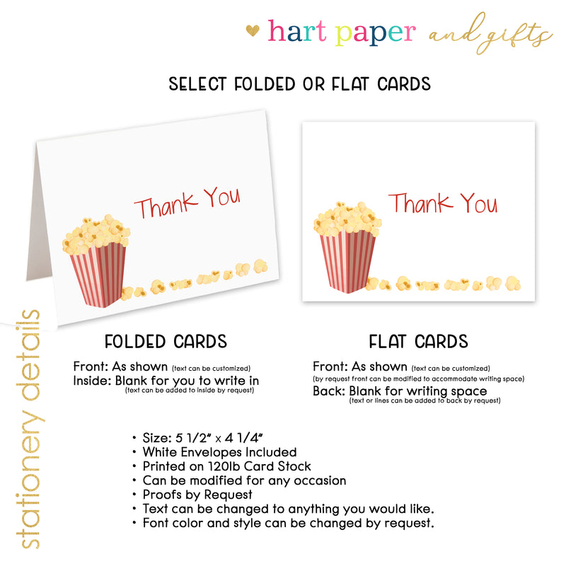 Popcorn Movie Thank You Cards Note Card Personalized Custom Stationery • Flat or Folded
