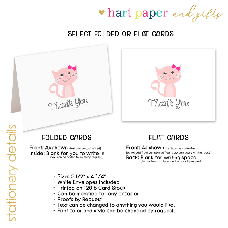 Pink Cat Thank You Cards Note Card Personalized Custom Stationery • Flat or Folded