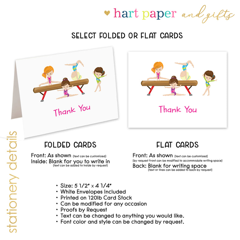 Gymnastics Thank You Cards Note Card Personalized Custom Stationery • Flat or Folded