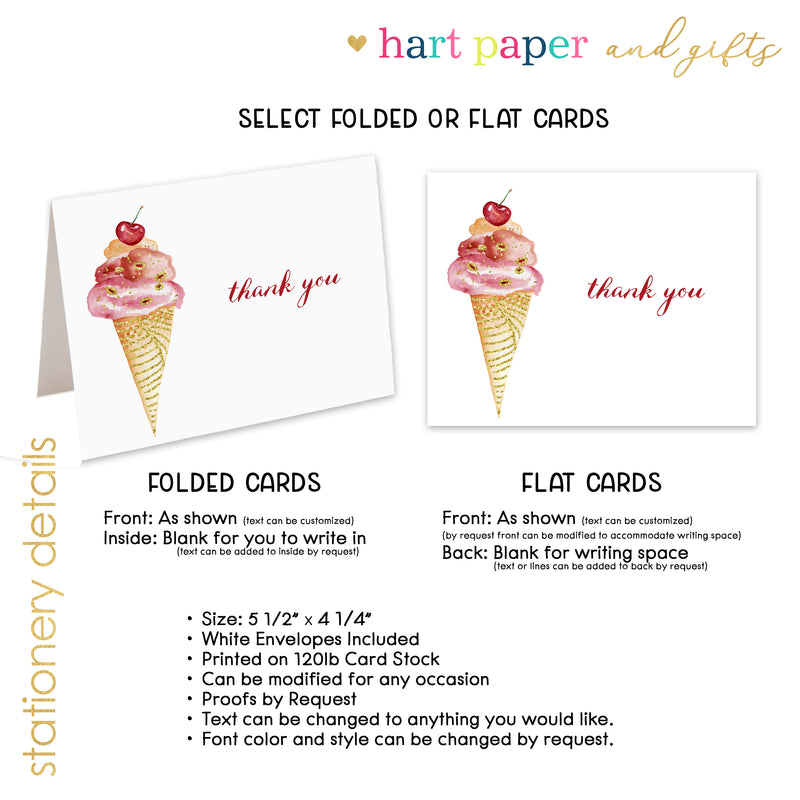 Ice Cream Thank You Cards Note Card Personalized Custom Stationery • Flat or Folded