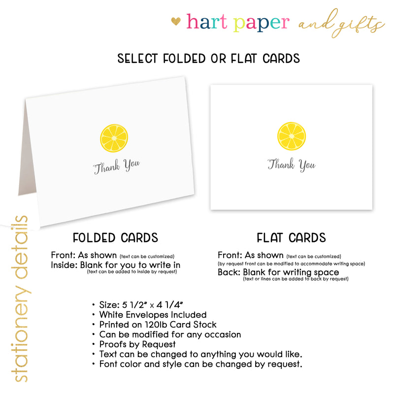 Lemon Thank You Cards Note Card Personalized Custom Stationery • Flat or Folded