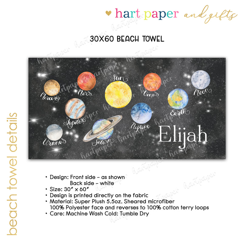 Planets Personalized Beach Towel • Custom 30x60 Swimming Swim Bath Bathroom Pool