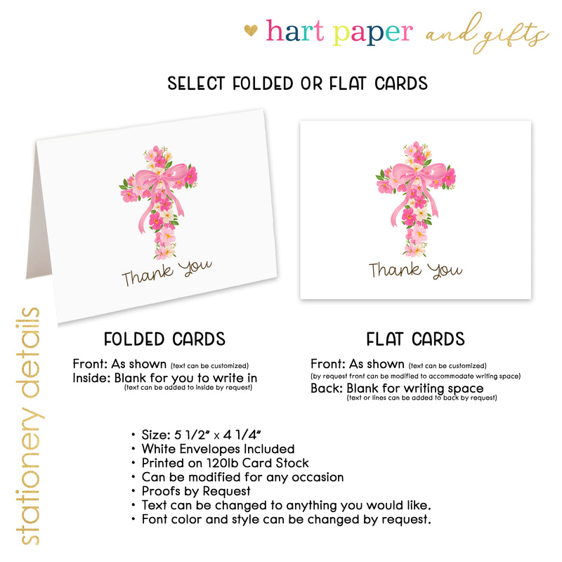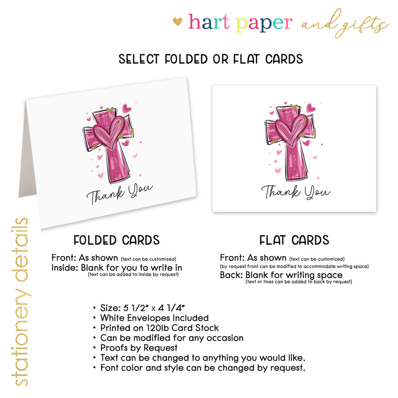 Pink Cross Thank You Cards Note Card Personalized Custom Stationery • Flat or Folded