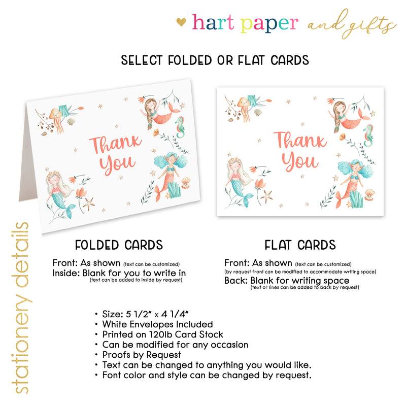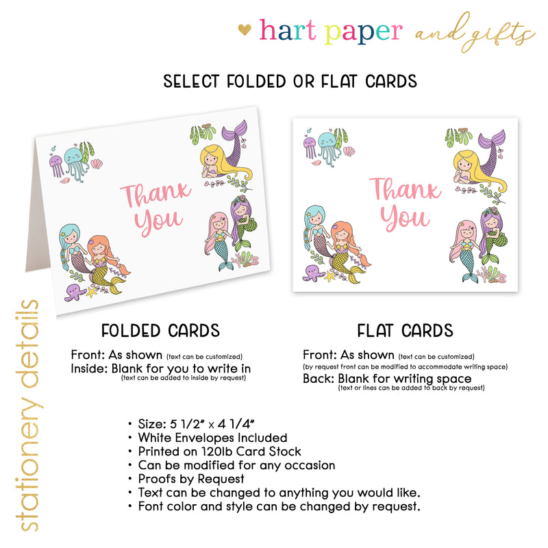 Mermaid Rainbow Thank You Cards Note Card Personalized Custom Stationery • Flat or Folded