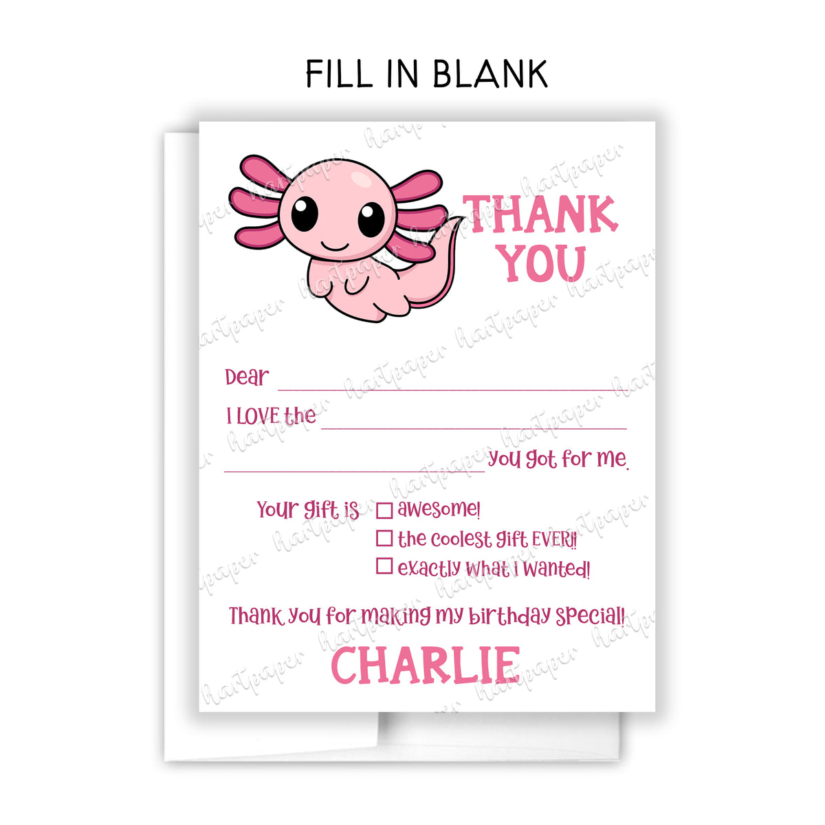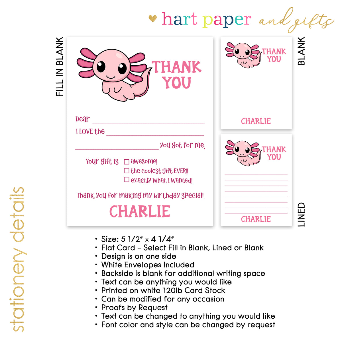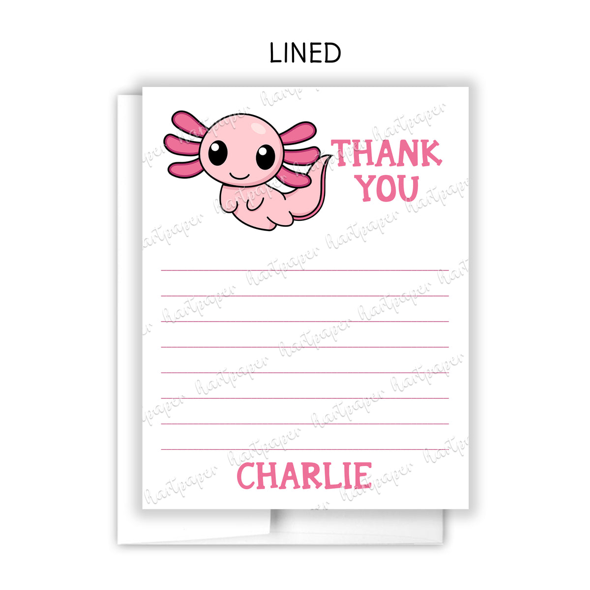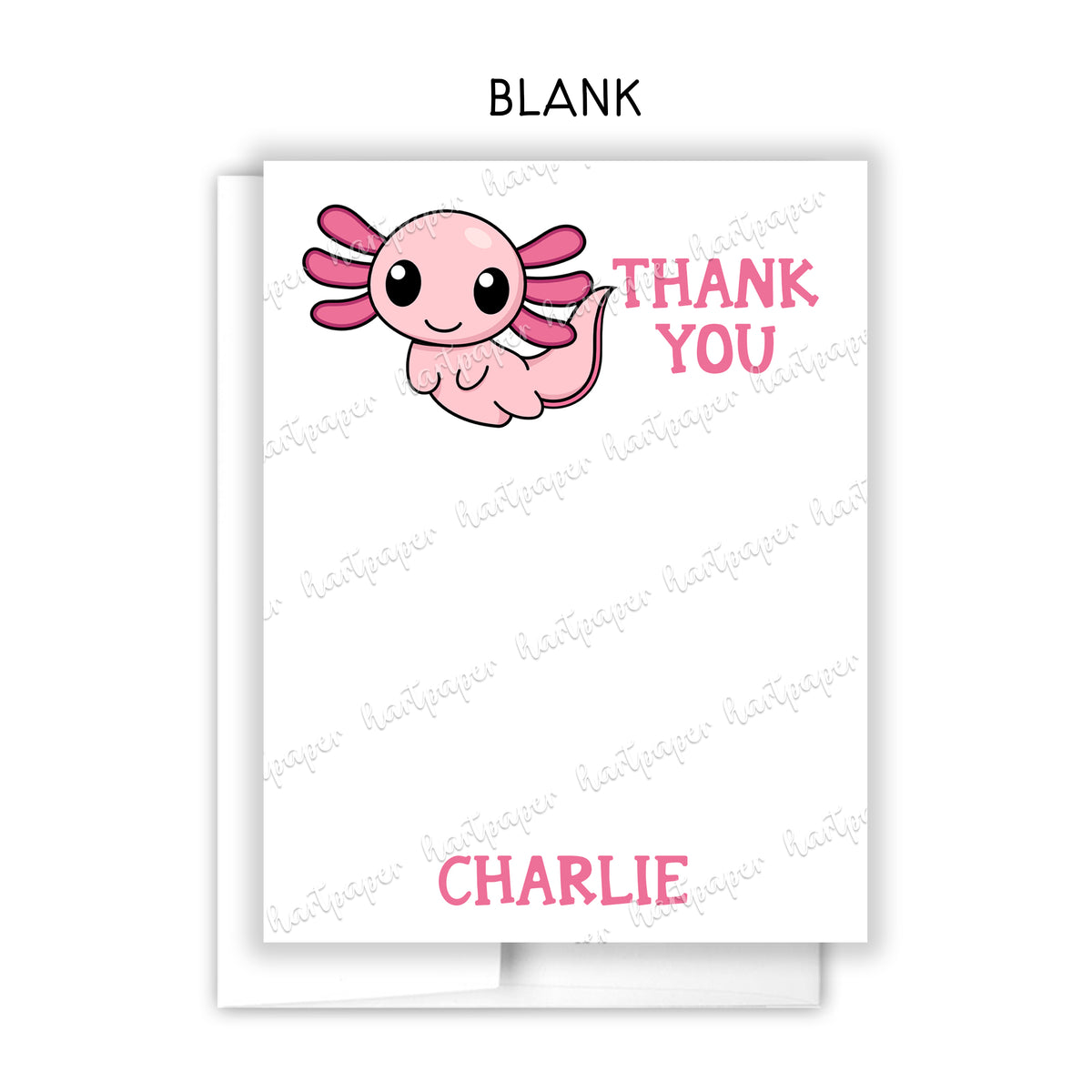 Axolotl Thank You Note Card Personalized Custom Stationery • Fill in Blank, Lined or Blank Cards