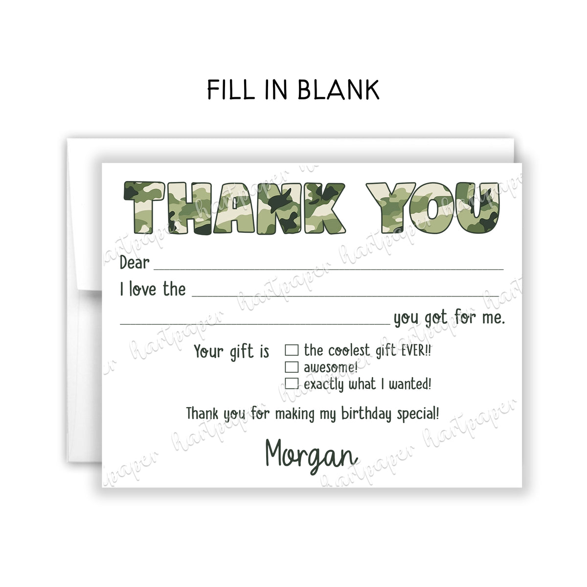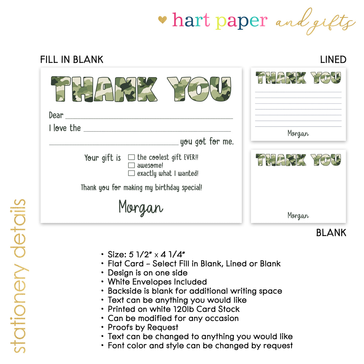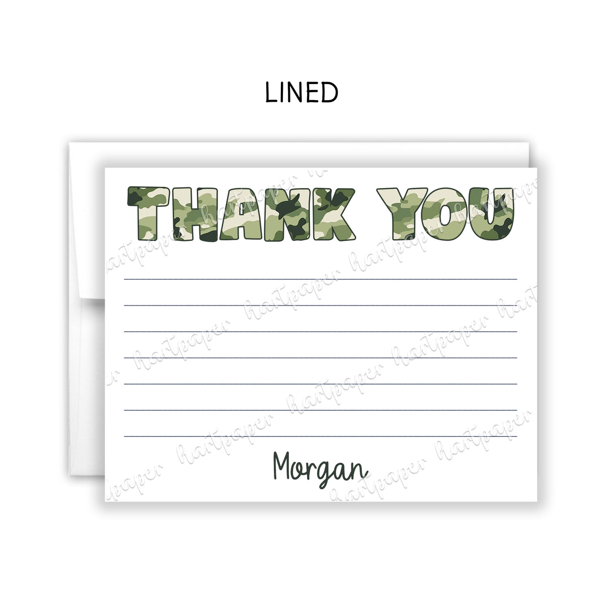 Camouflage Camo Thank You Note Card Personalized Custom Stationery • Fill in Blank, Lined or Blank Cards