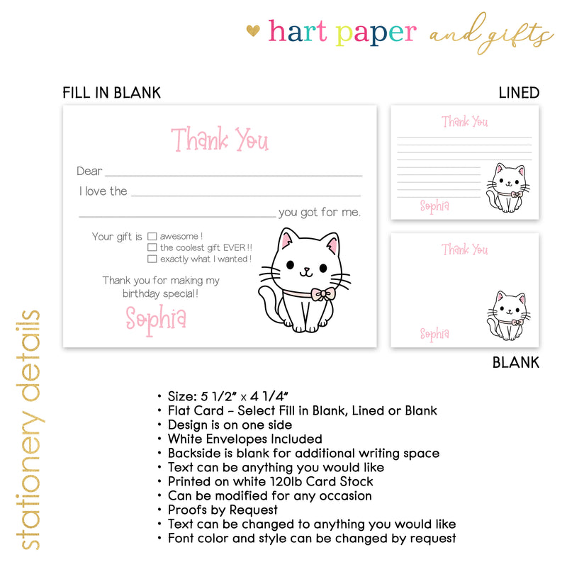 Cat Kitten Thank You Note Card Personalized Custom Stationery • Fill in Blank, Lined or Blank Cards