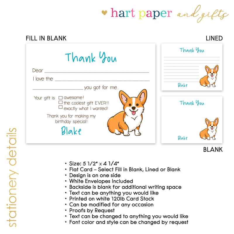 Corgi Dog Thank You Note Card Personalized Custom Stationery • Fill in Blank, Lined or Blank Cards