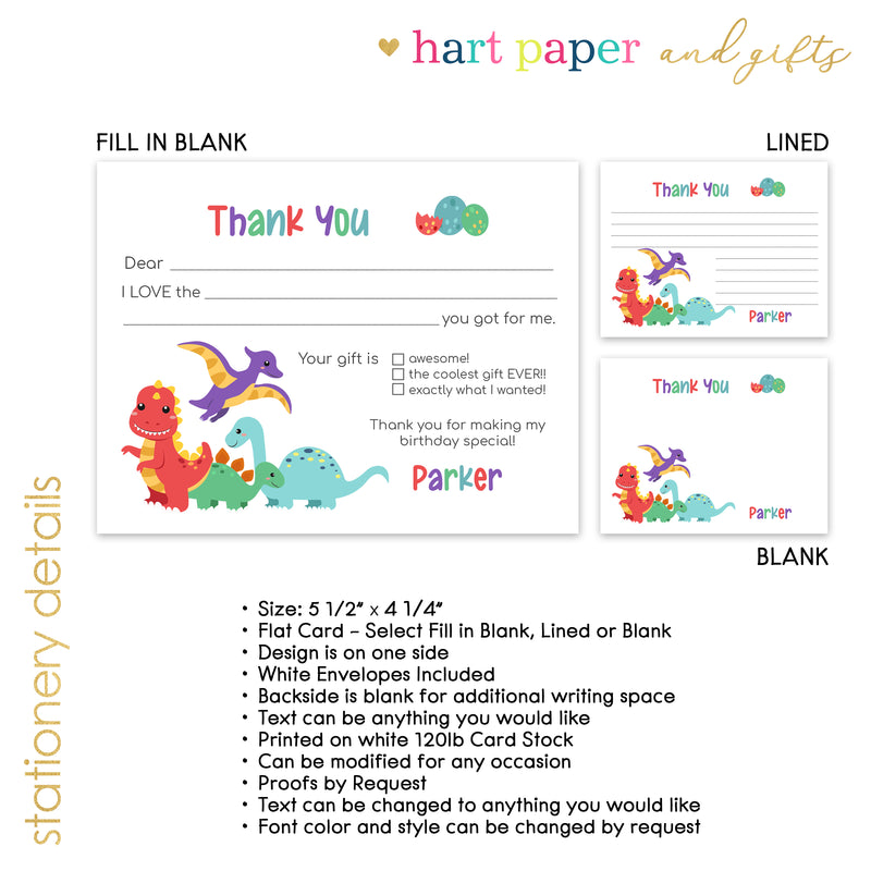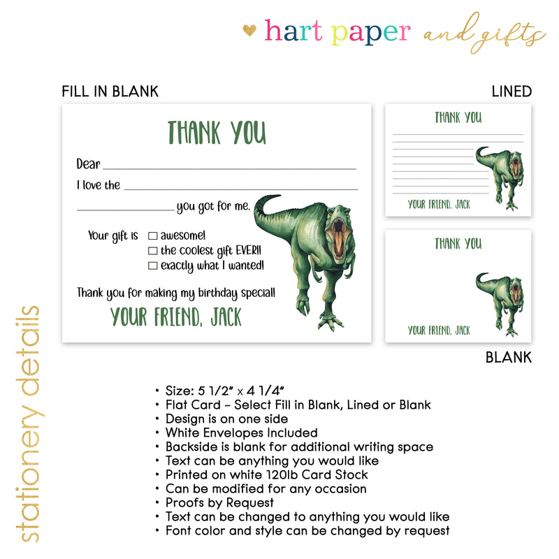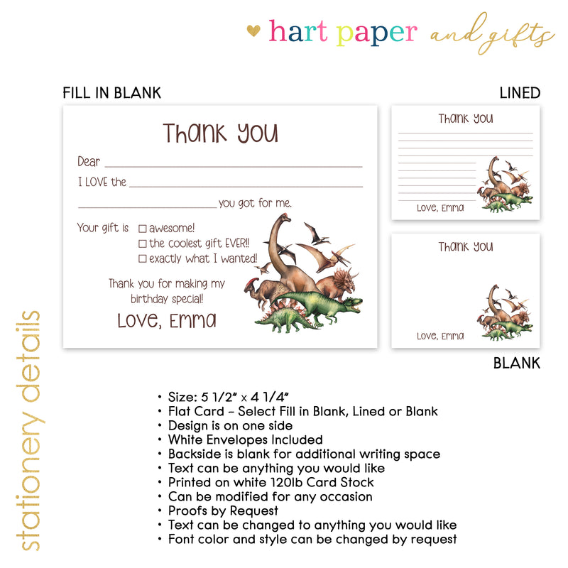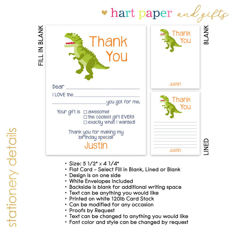 Dinosaur Thank You Note Card Personalized Custom Stationery • Fill in Blank, Lined or Blank Cards