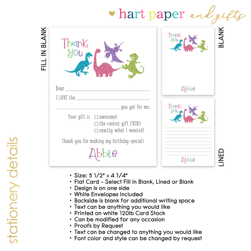 Girly Dinosaur Thank You Note Card Personalized Custom Stationery • Fill in Blank, Lined or Blank Cards