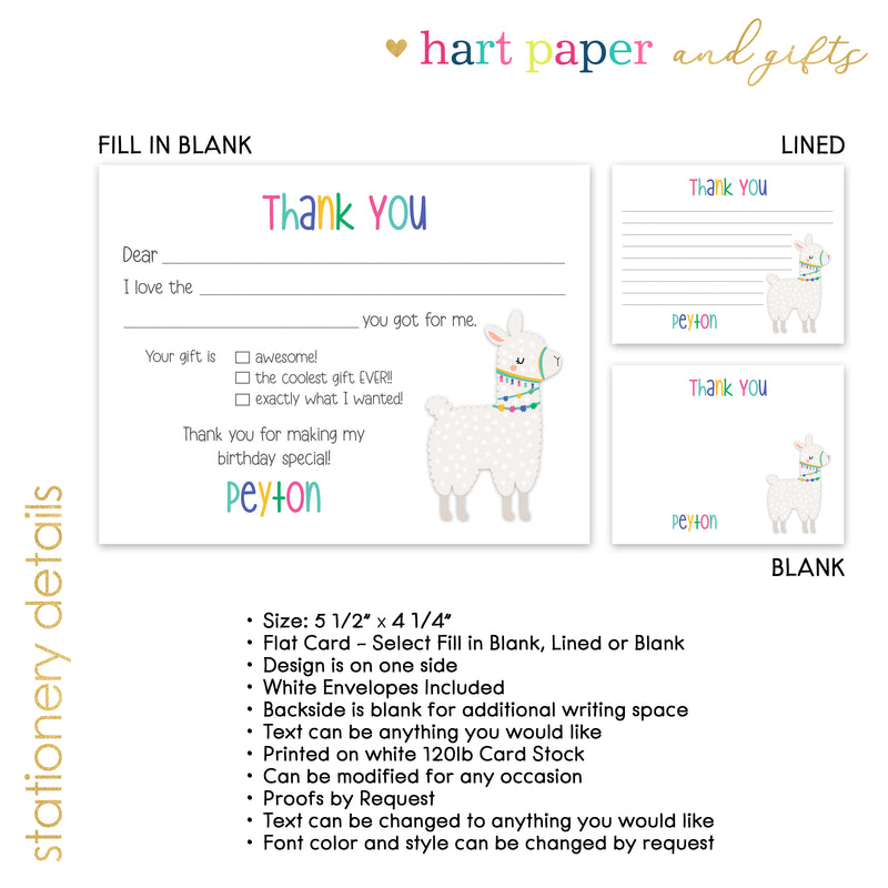 Llama Thank You Note Card Personalized Custom Stationery • Fill in Blank, Lined or Blank Cards